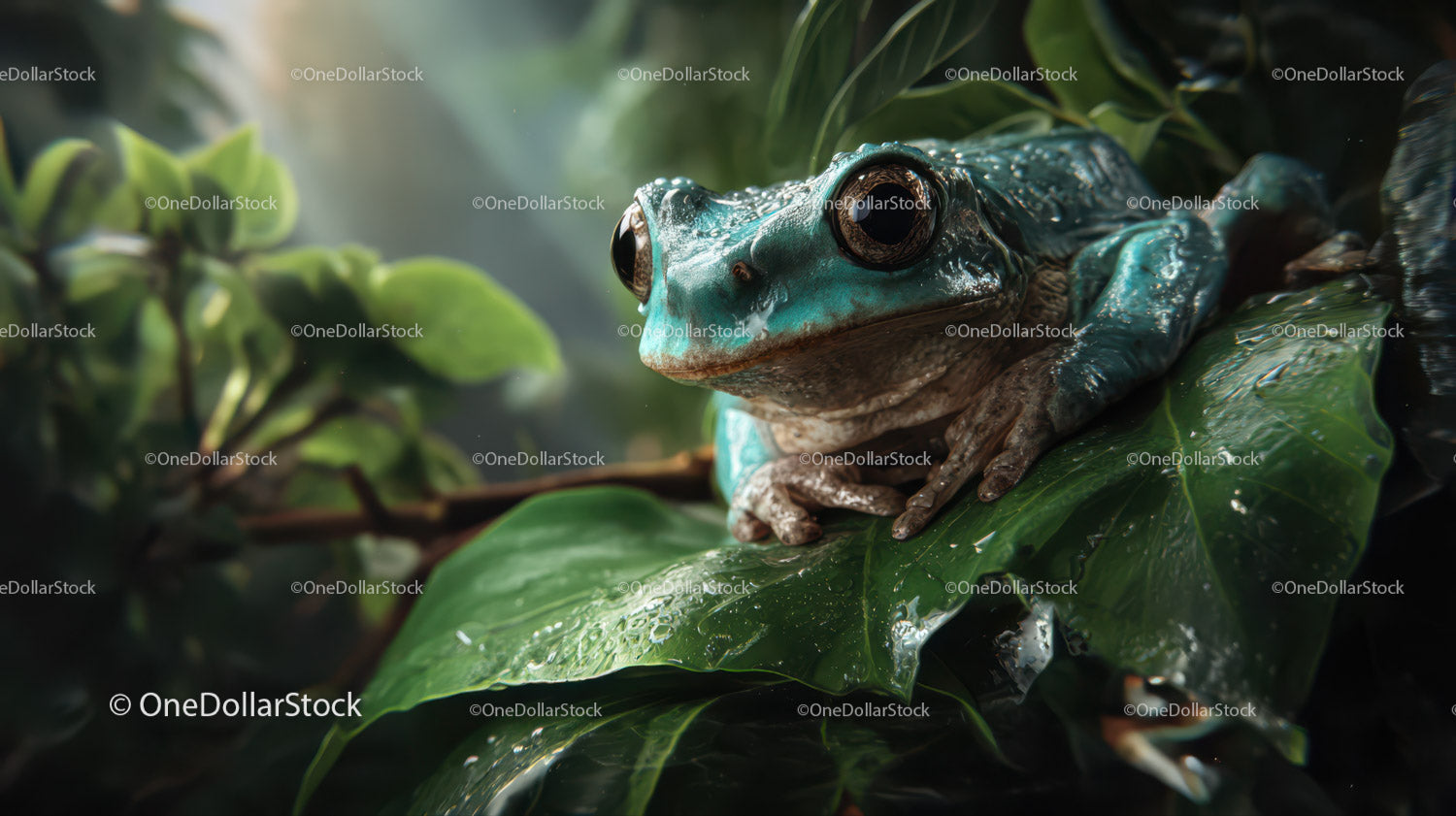 Zielona żaba odpoczywająca na liściu w tropikalnej scenerii lasu deszczowego