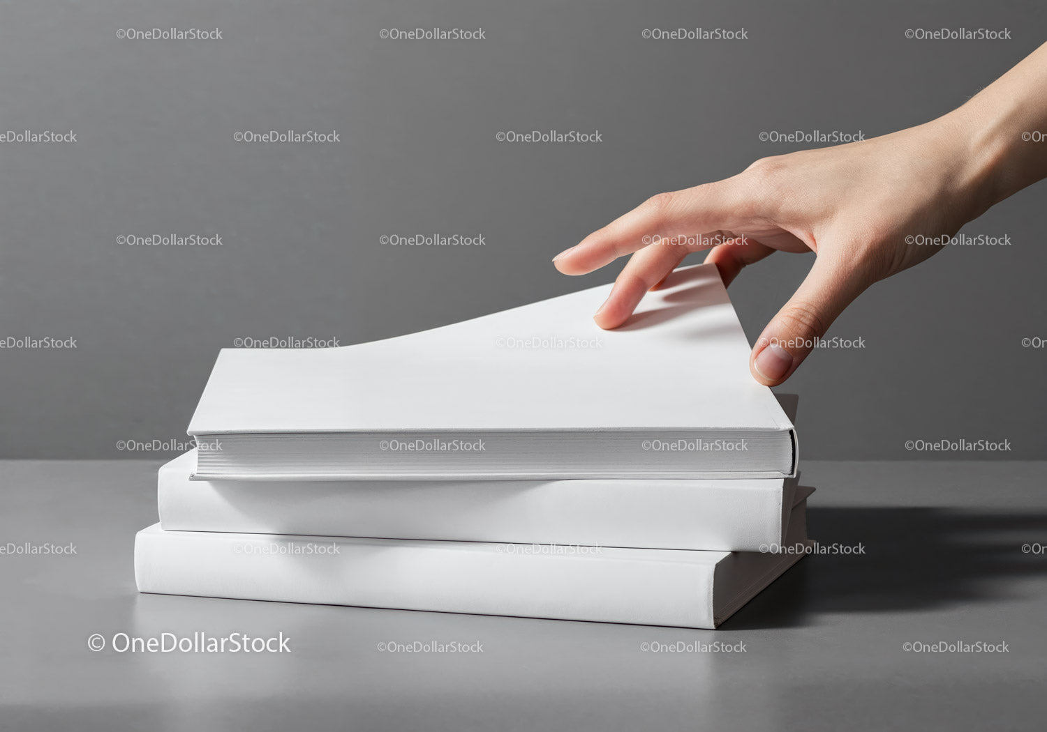 Ręka sięgająca po książkę ze stosu na szarej powierzchni