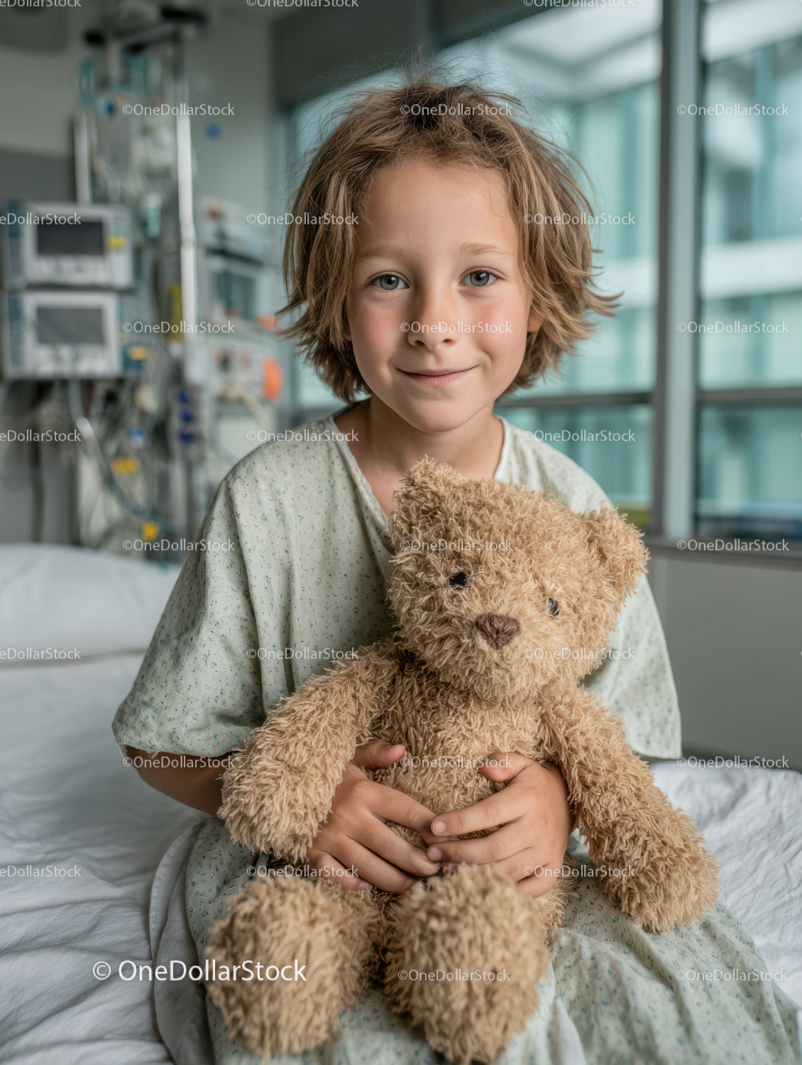 Szczęśliwe dziecko trzymające pluszowego misia w pokoju szpitalnym ze sprzętem medycznym
