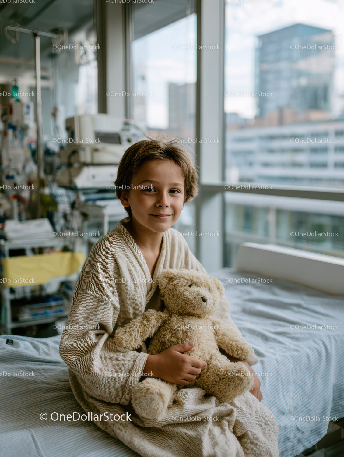 Szczęśliwe dziecko siedzące w pokoju szpitalnym z misiem pluszowym