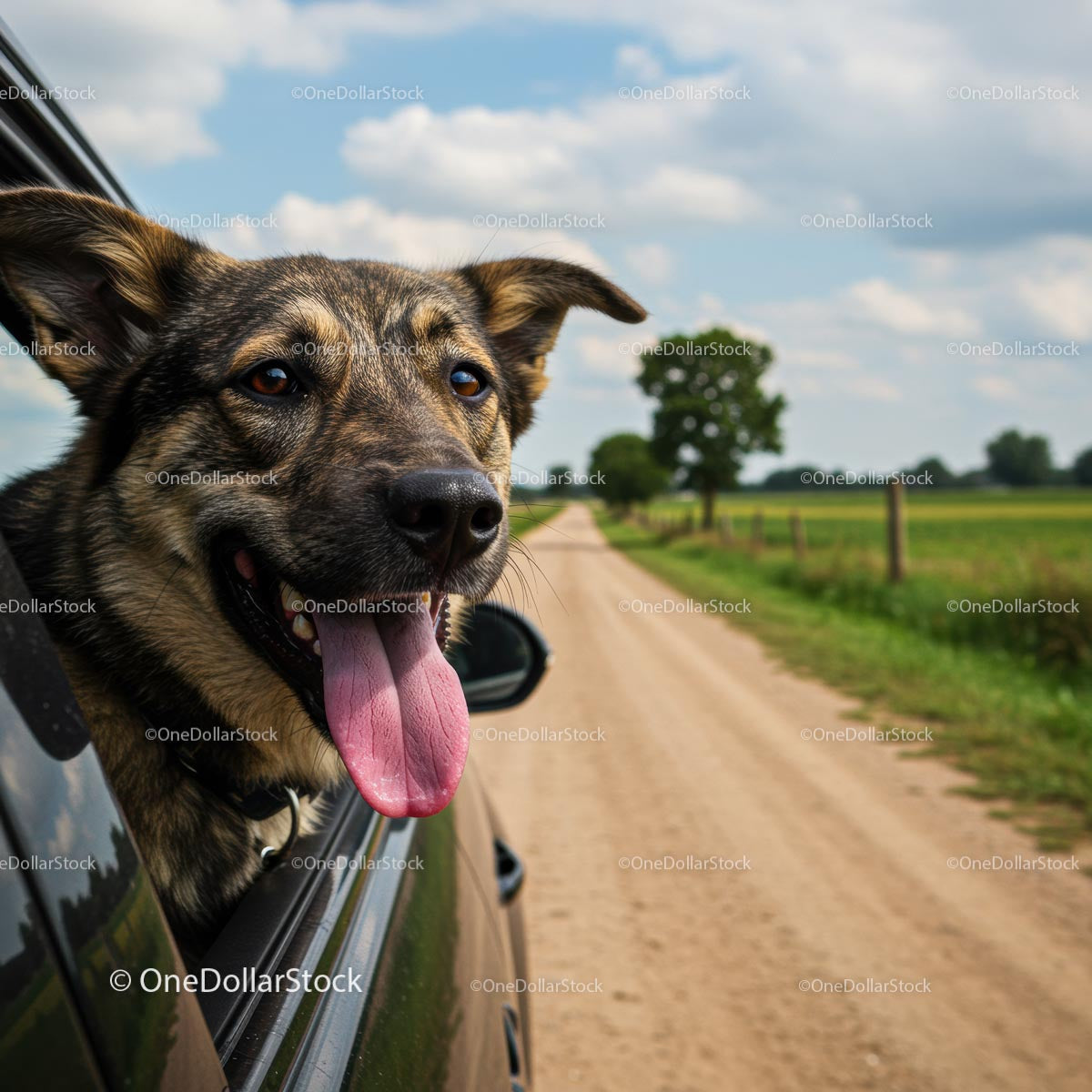 Szczęśliwy pies cieszy się jazdą samochodem po wsi