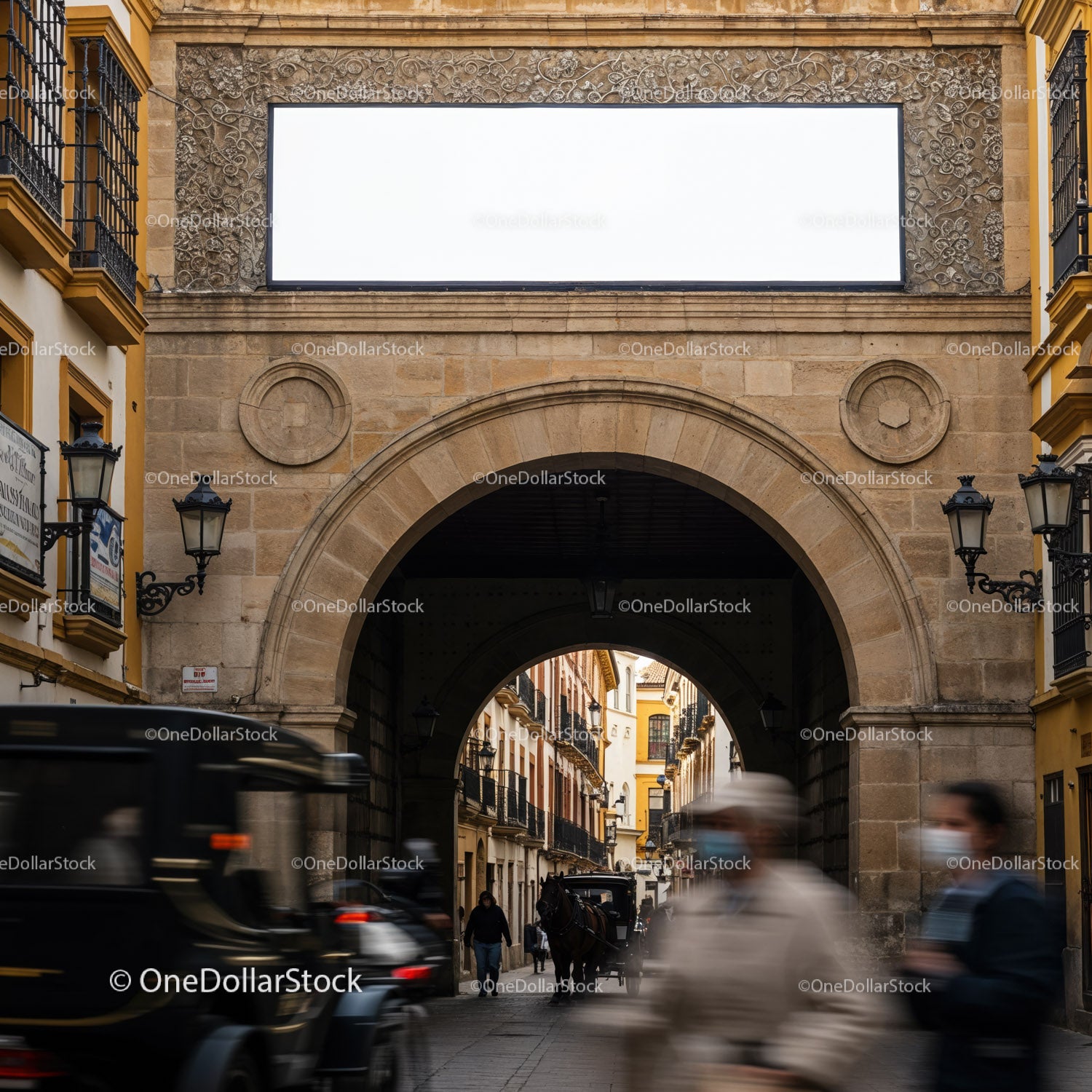 Historyczny kamienny łuk otaczający tętniącą życiem ulicę starego miasta