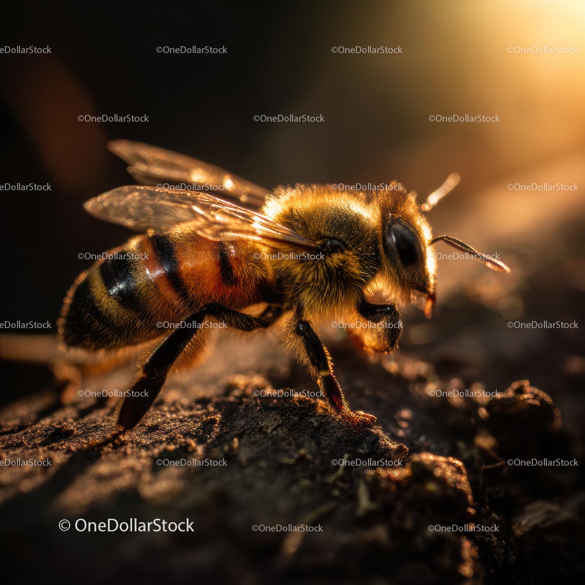 Pszczoła miodna w świetle zachodzącego słońca na korze drzewa