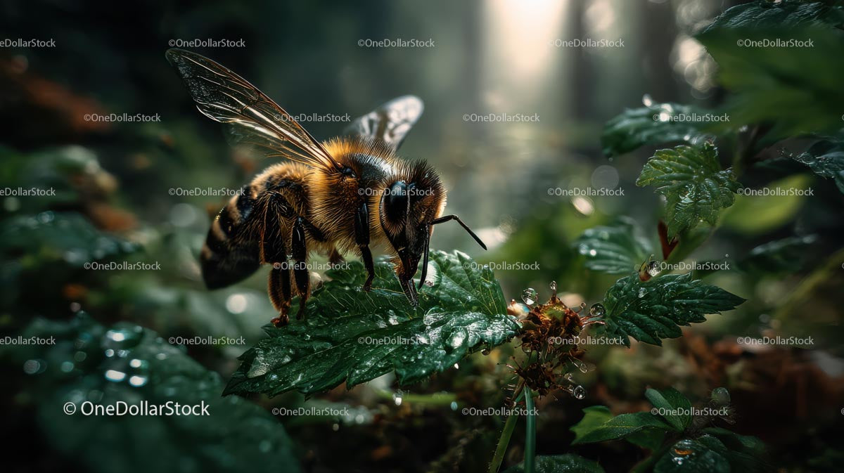 Pszczoła miodna na pokrytym rosą liściu w bujnym leśnym otoczeniu