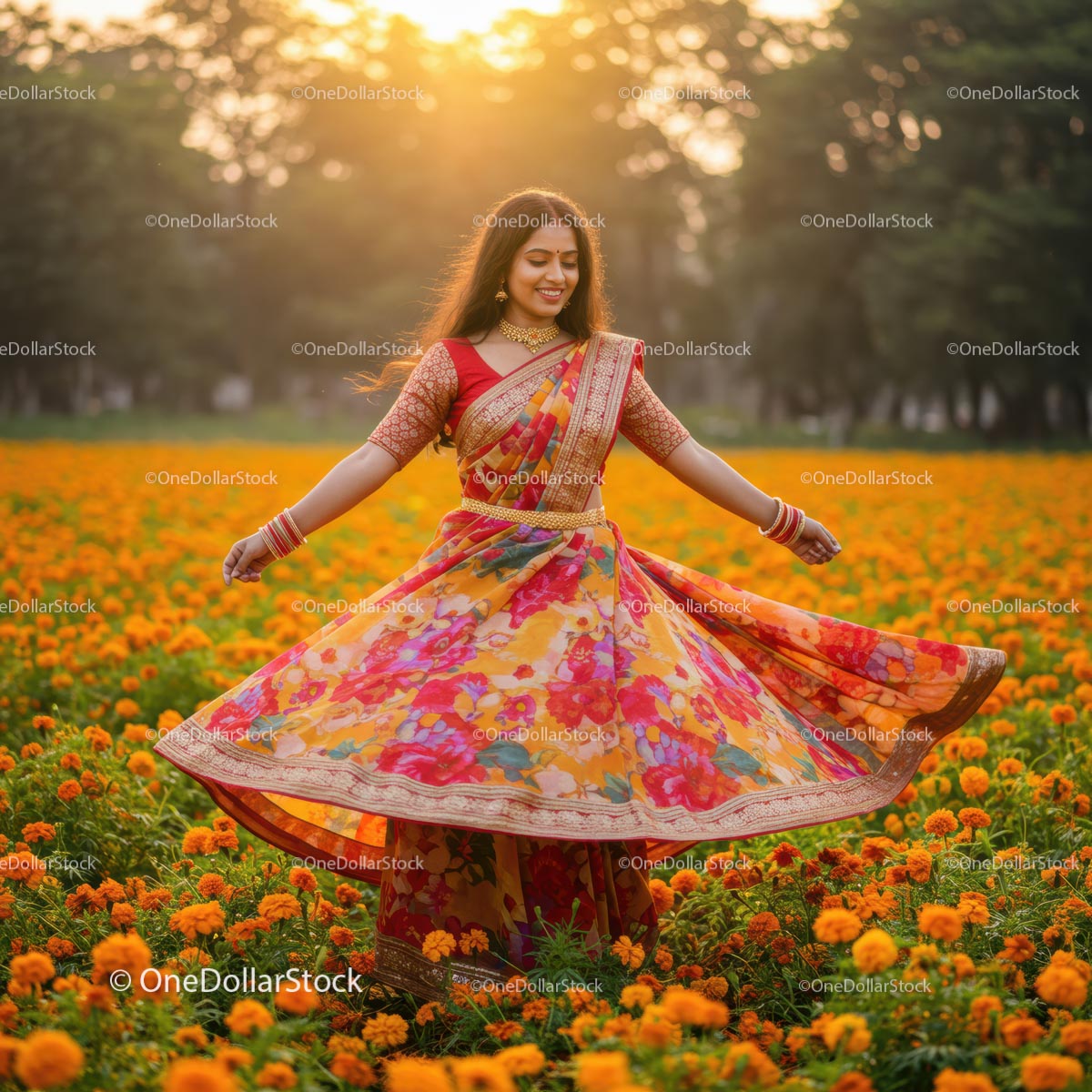Hinduska tańczy na tętniącym życiem polu nagietków o zachodzie słońca