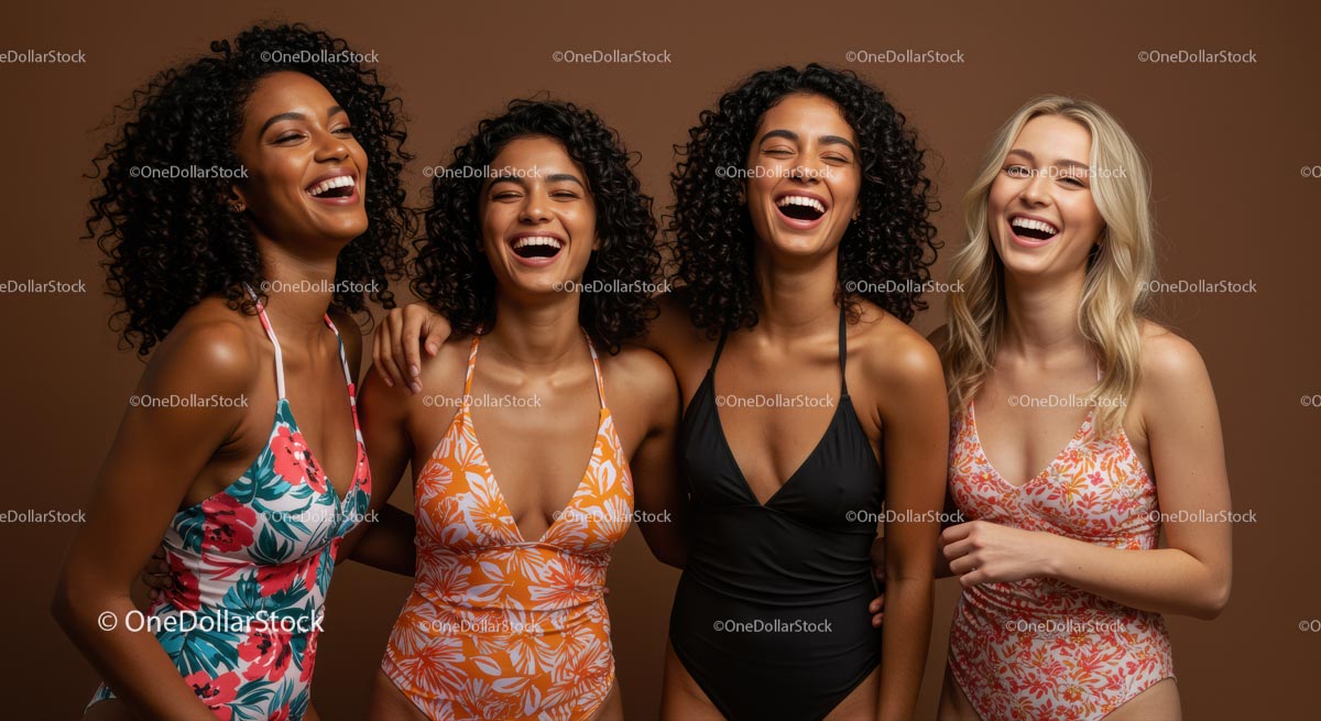 Radosna grupa kobiet w kolorowych strojach kąpielowych śmiejących się razem