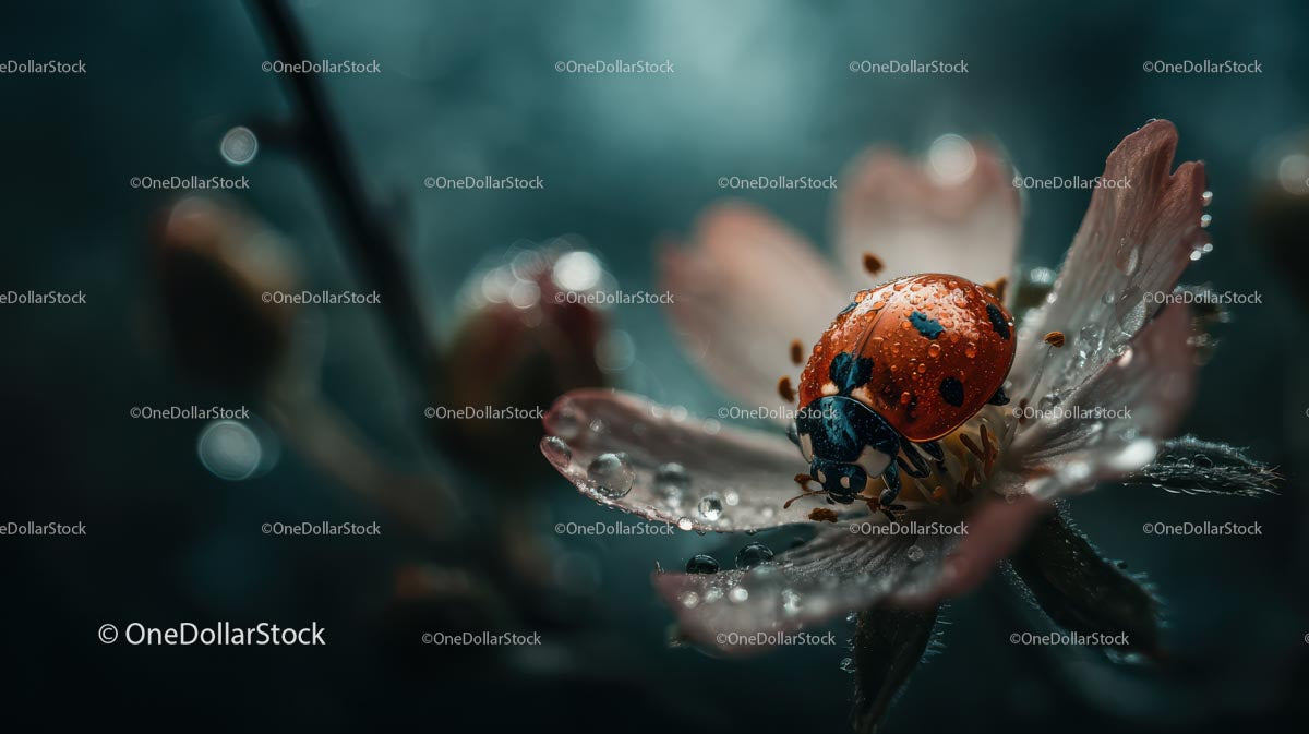 Biedronka odpoczywająca na płatku kwiatu muśniętym deszczem