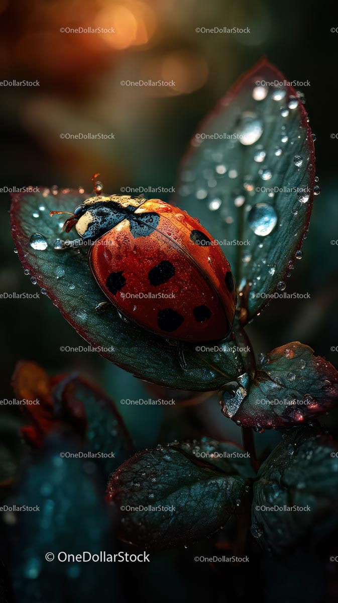 Biedronka odpoczywająca na pokrytym rosą liściu w porannym świetle