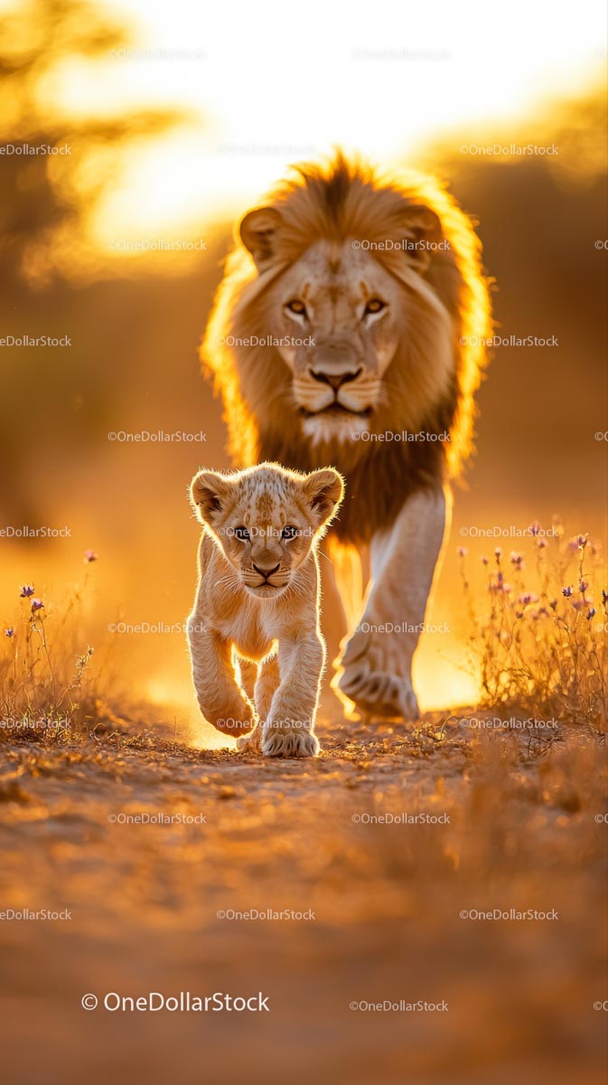 Lew i młode spacerują o zachodzie słońca na afrykańskim safari