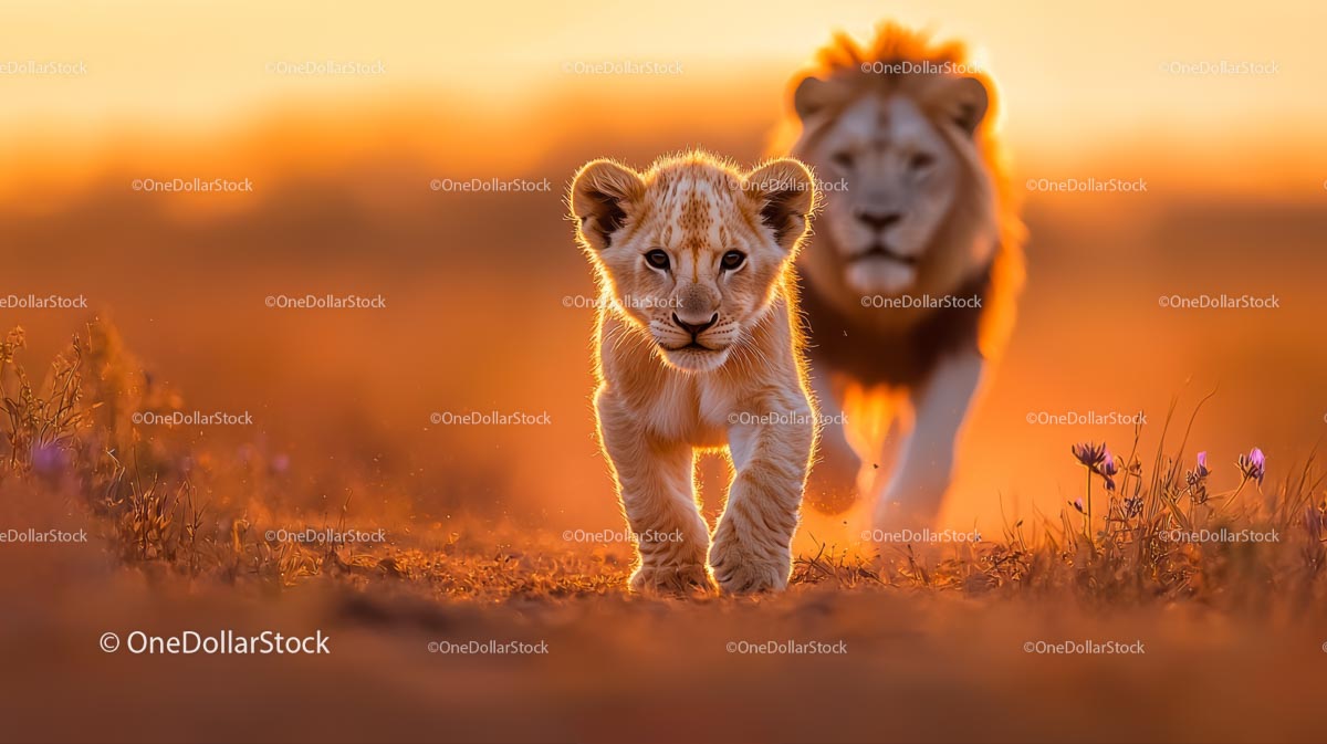 Młody lew i dorosły lew o zachodzie słońca na sawannie