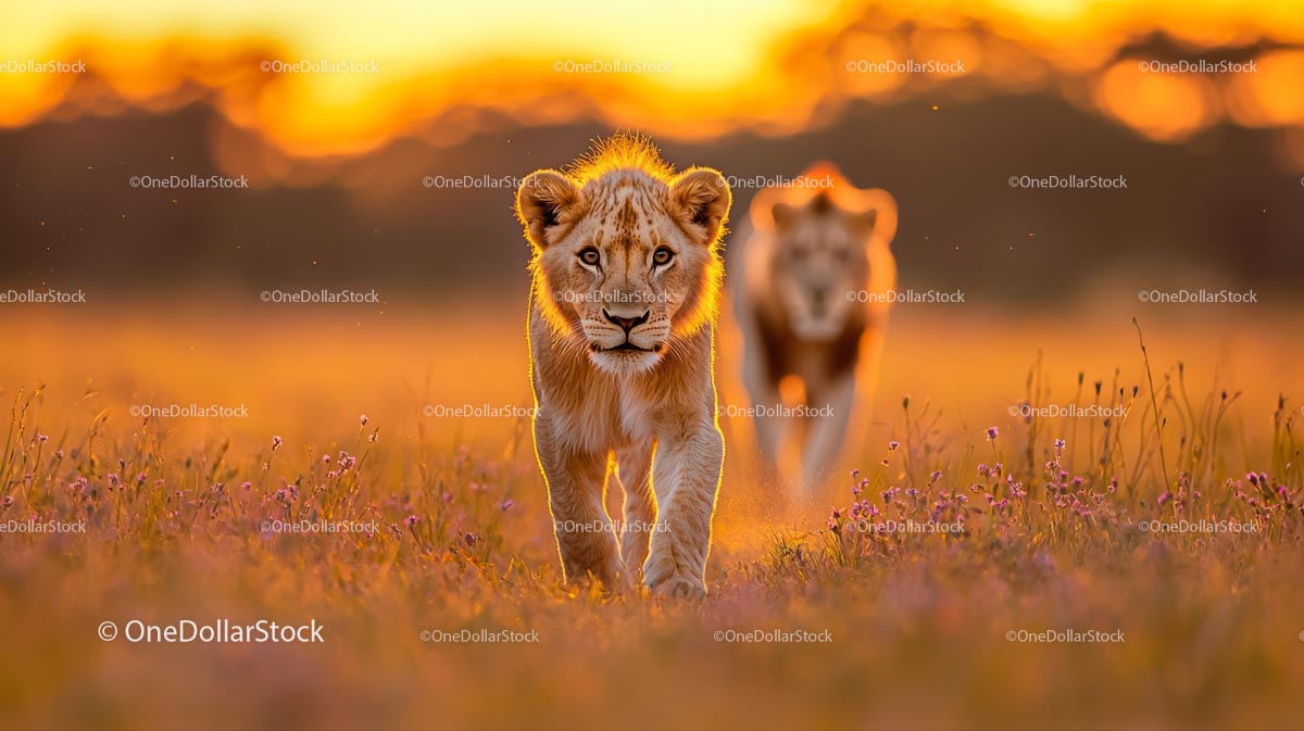 Lwiątko spacerujące po afrykańskiej sawannie o zachodzie słońca