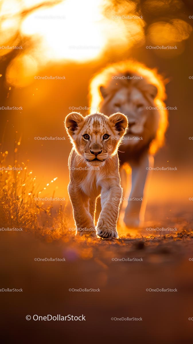 Lwiątko spacerujące po słonecznej afrykańskiej sawannie