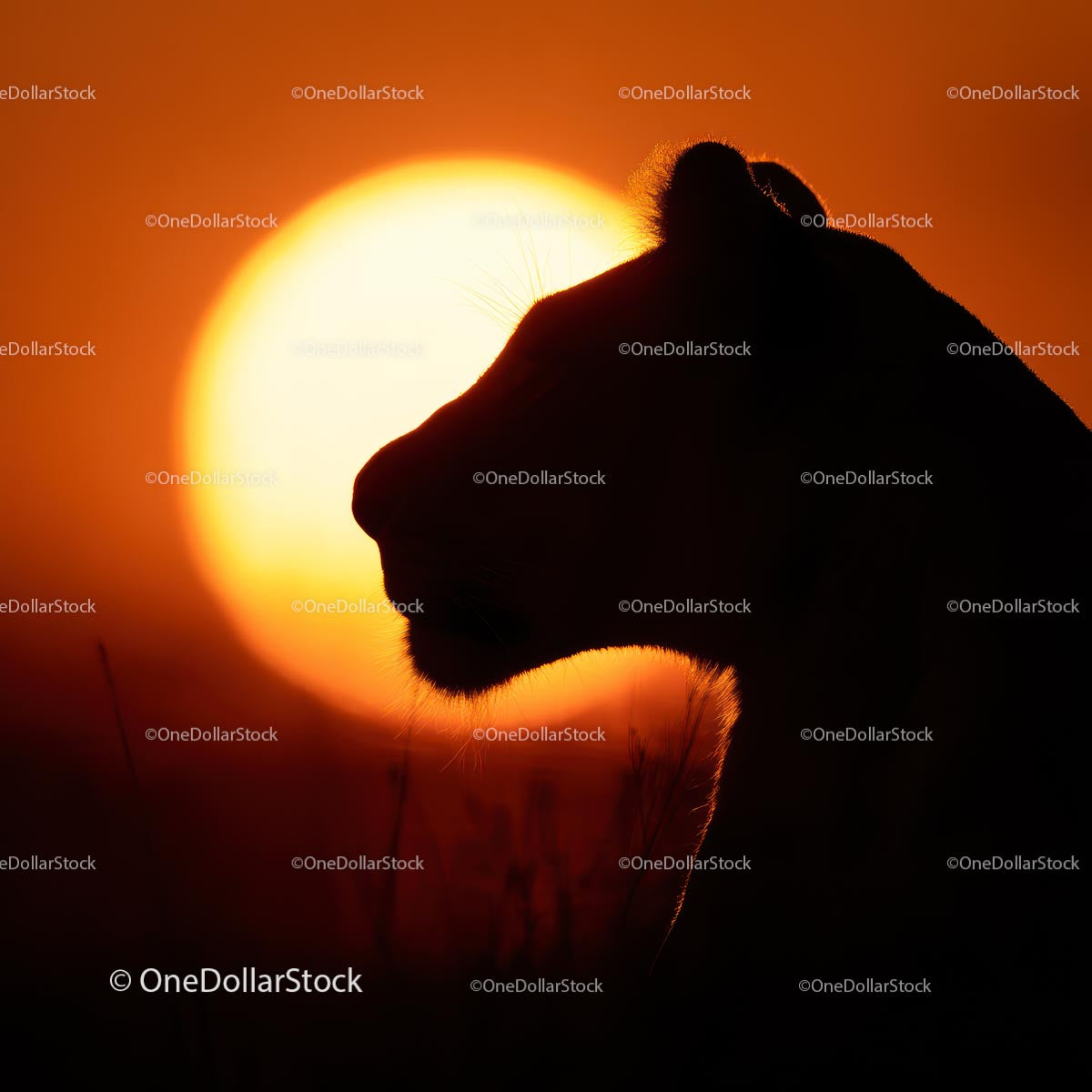 Sylwetka lwa na tle afrykańskiego zachodu słońca