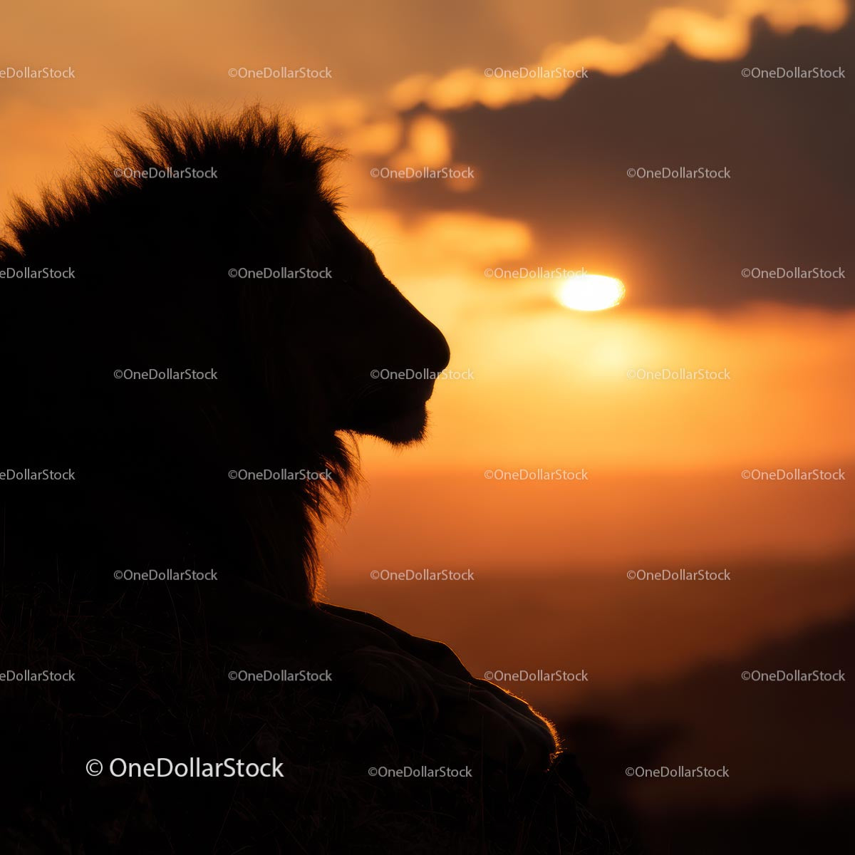 Sylwetka lwa na tle żywego afrykańskiego zachodu słońca