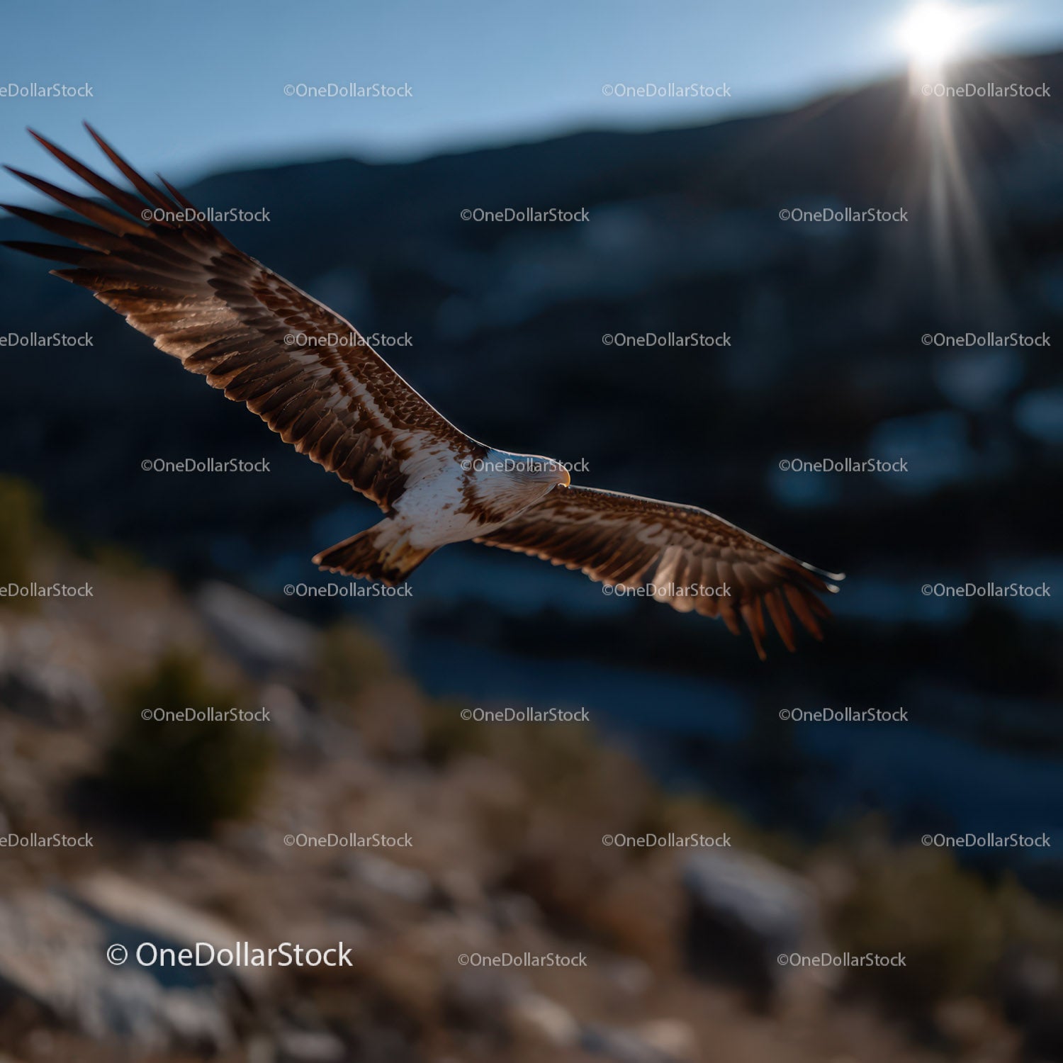 Majestatyczny ptak drapieżny szybujący nad górskim krajobrazem o świcie