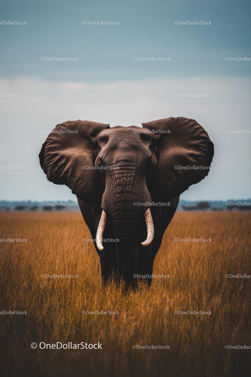 Potężny słoń dumnie stoi na otwartych trawiastych równinach afrykańskiej sawanny. Jego imponujące kły i potężne uszy eksponują się w całej okazałości, tworząc zapierający dech w piersiach obraz majestatu natury. W tle rozciąga się horyzont, podkreślając ogrom naturalnego siedliska. Ta scena oddaje istotę dzikiej przyrody i piękno dziczy.