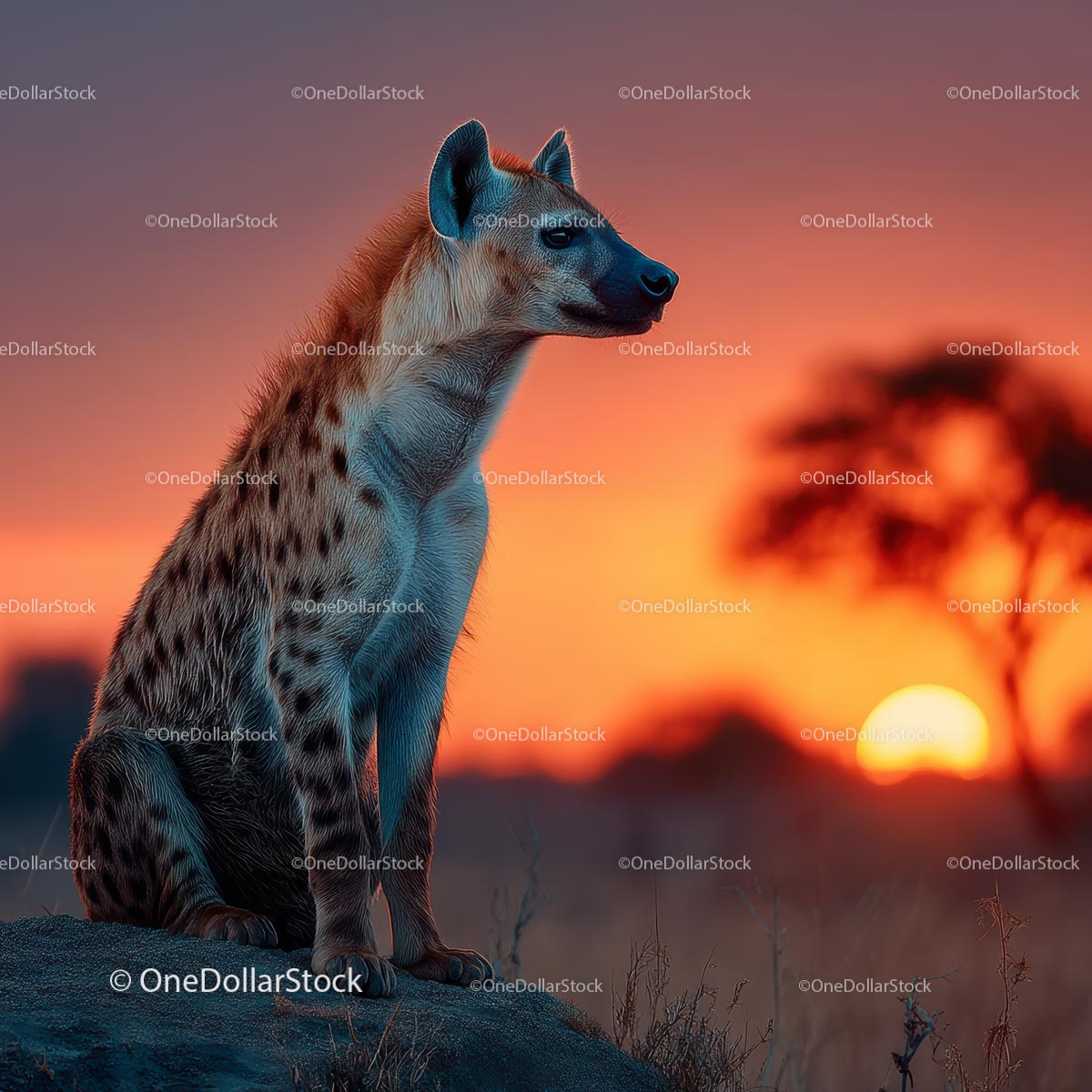 Majestatyczna sylwetka hieny na tle żywego afrykańskiego zachodu słońca