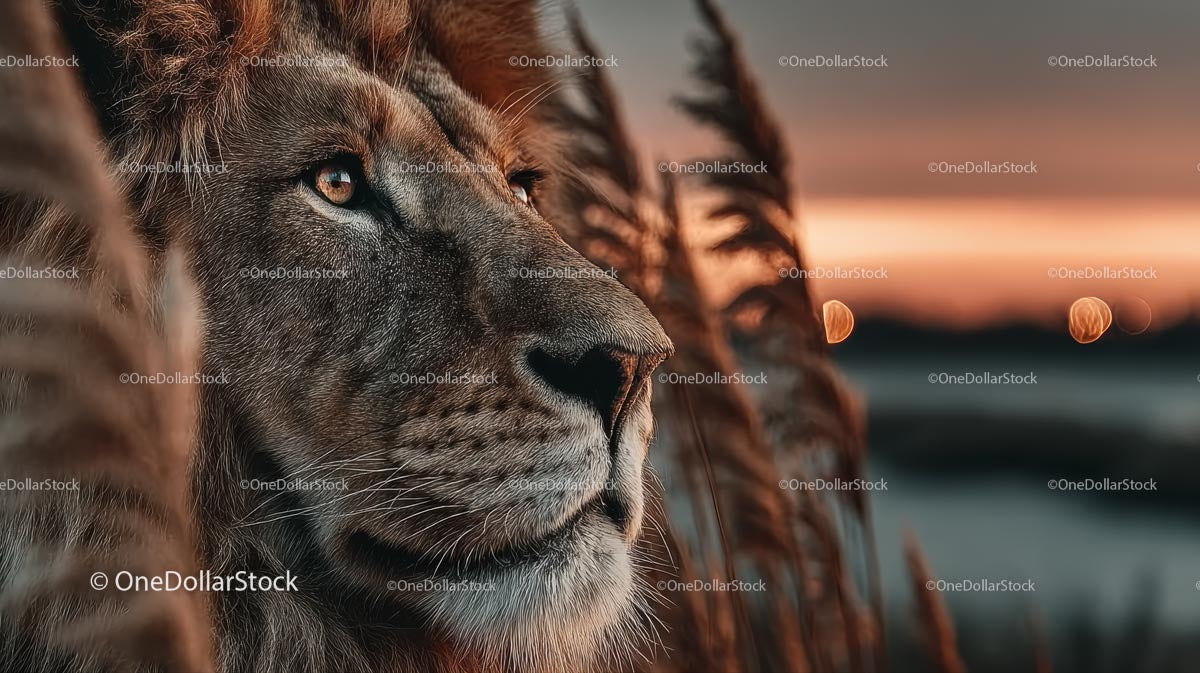 Majestatyczny lew o zachodzie słońca ze złotą grzywą