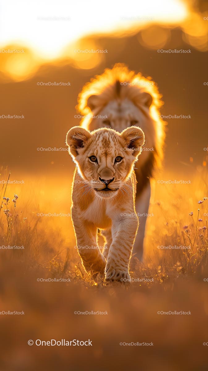 Majestatyczny lew spacerujący w ciepłym blasku zachodzącego słońca
