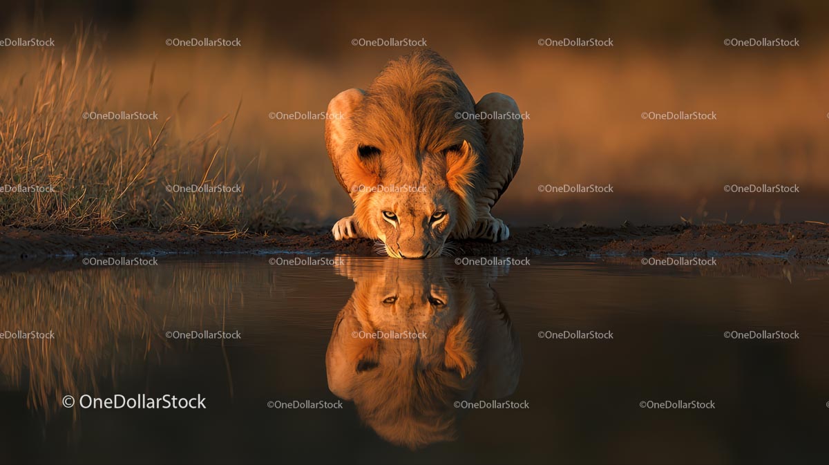 Majestatyczny lew pijący przy odbiciu w wodzie o zachodzie słońca