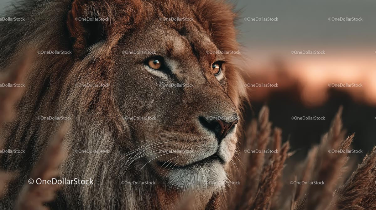 Majestatyczny lew patrzący na zachód słońca na sawannie