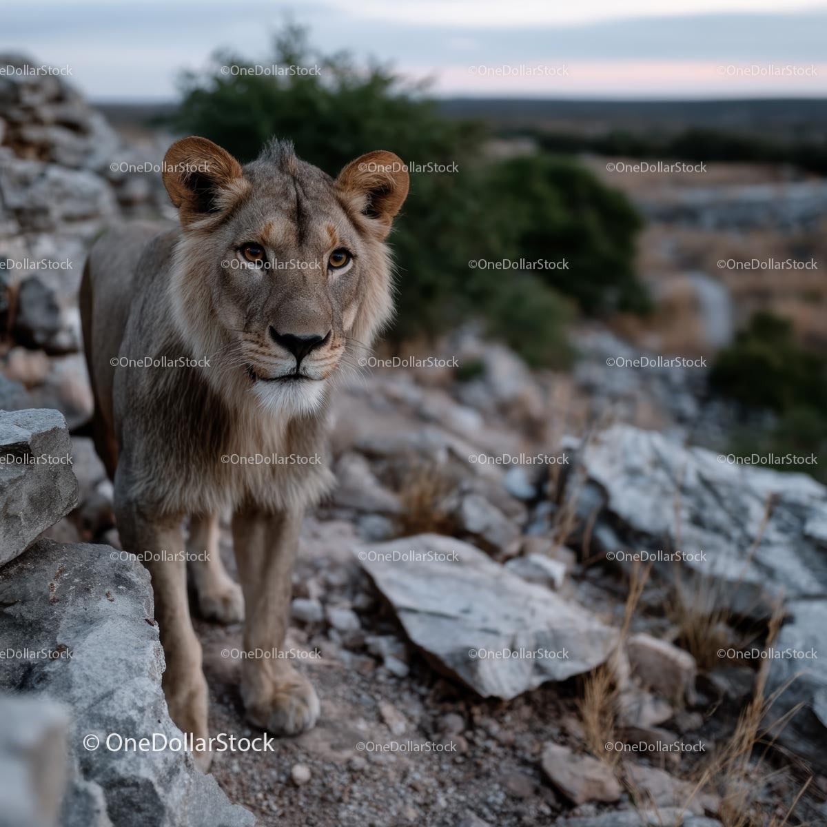 Majestatyczny lew w skalistym krajobrazie Afryki
