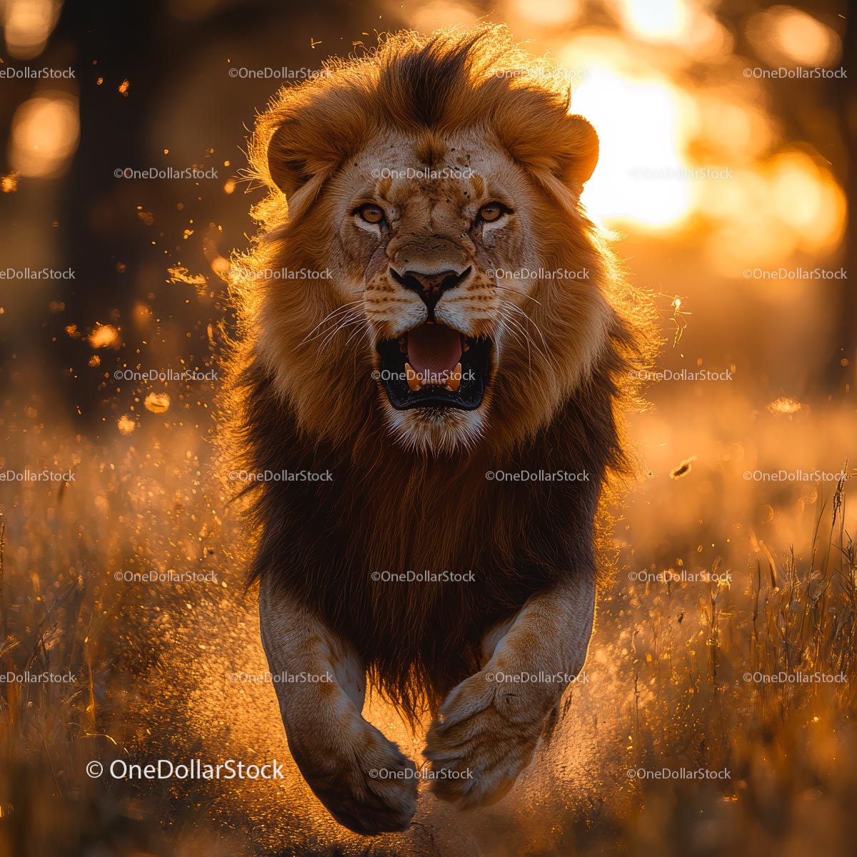 Majestatyczny lew ryczący o zachodzie słońca na afrykańskiej sawannie