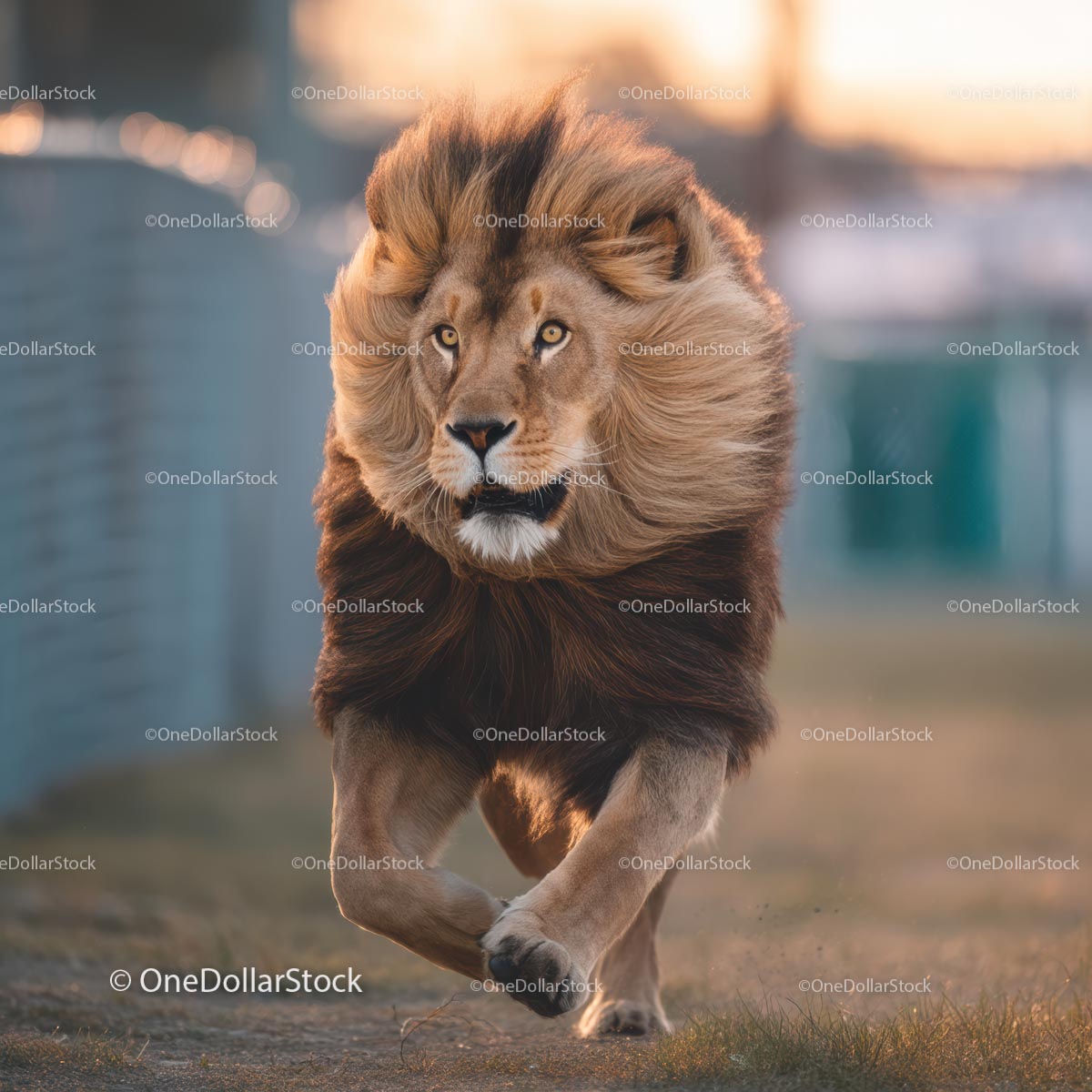 Majestatyczny lew biegnący przez sawannę o zachodzie słońca