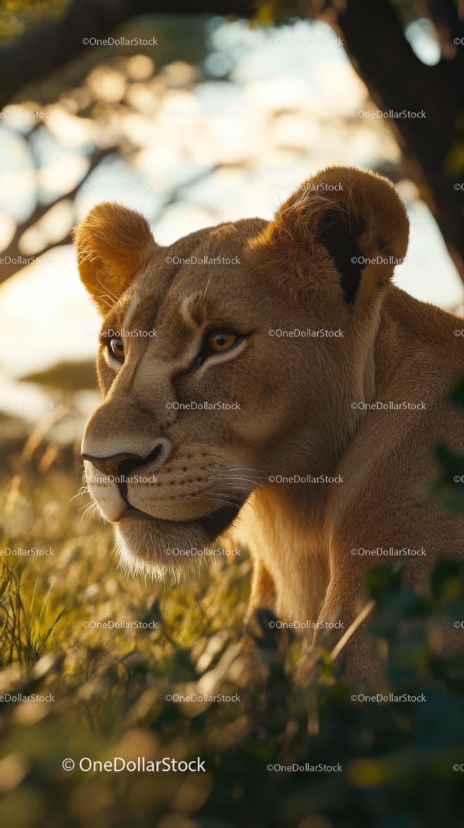Majestatyczna lwica odpoczywająca na złotych łąkach