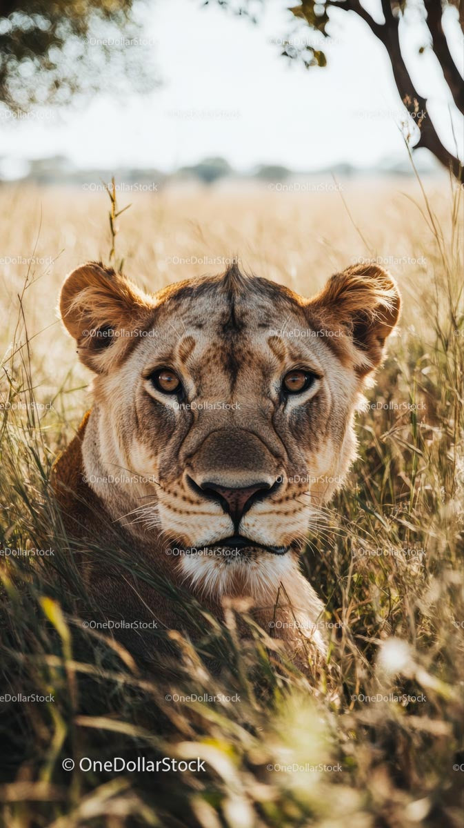 Majestatyczna lwica odpoczywająca w trawiastej afrykańskiej sawannie