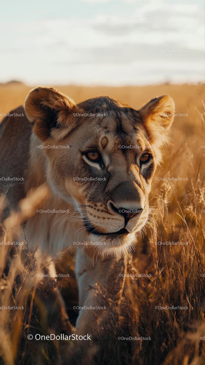 Majestatyczna lwica przechadzająca się przez złotą trawę sawanny