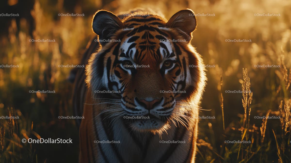 Majestatyczny tygrys na trawiastych równinach Golden Sunrise