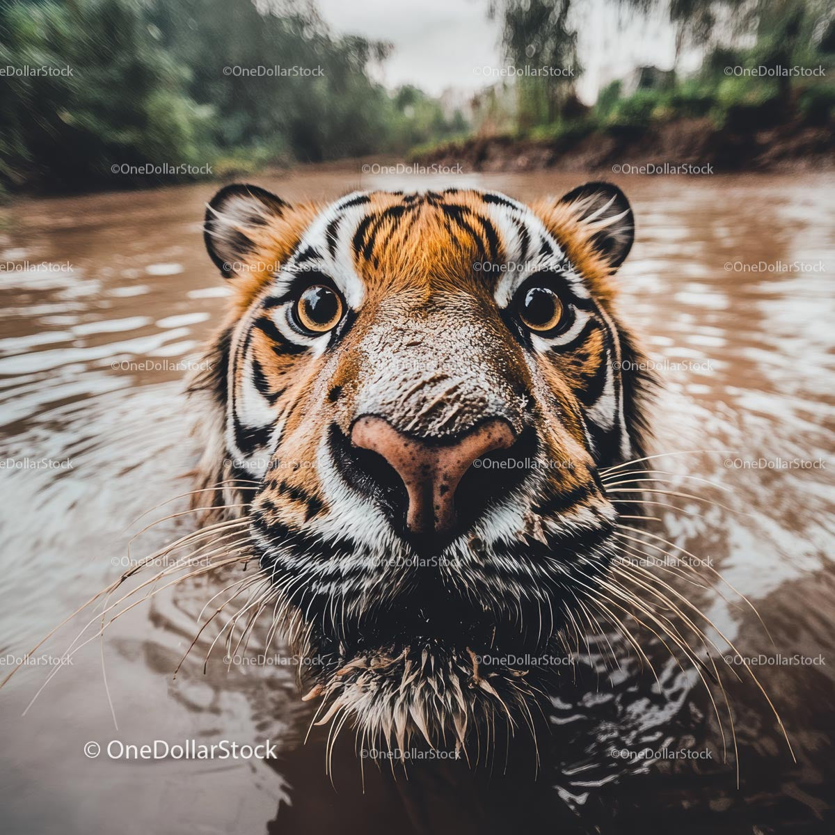 Oszałamiające zbliżenie majestatycznego tygrysa częściowo zanurzonego w wodzie. Intensywne spojrzenie tygrysa i uderzające rysy twarzy zostały pięknie uchwycone, ukazując jego siłę i wdzięk. Scena sugeruje naturalne środowisko, z bujną zielenią w tle. To zdjęcie doskonale oddaje istotę dzikiej przyrody i piękno dzikich drapieżników.