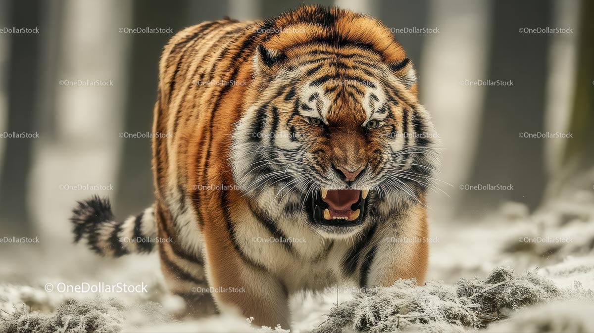 Majestatyczny tygrys ryczący w pokrytym śniegiem lesie