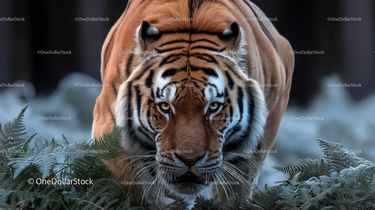 Majestatyczny tygrys przechadzający się wśród paproci na pustkowiu