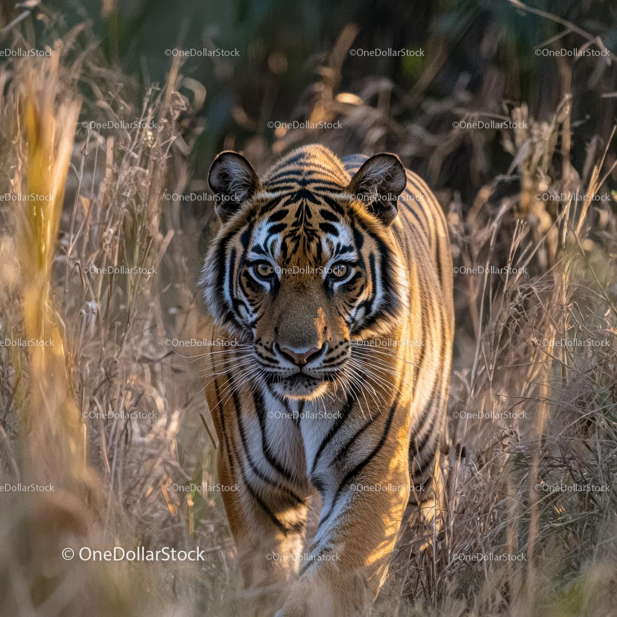 Majestatyczny tygrys dyskretnie przechadzający się po trawie
