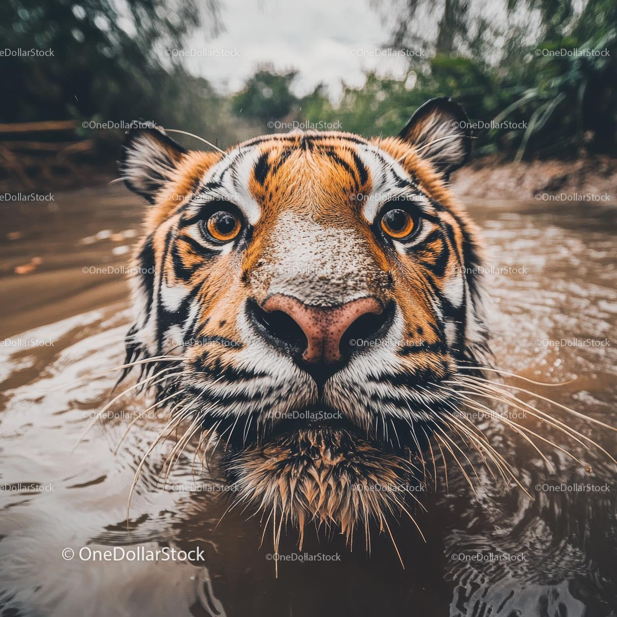 Majestatyczny tygrys pływający w mętnej wodzie z bliska
