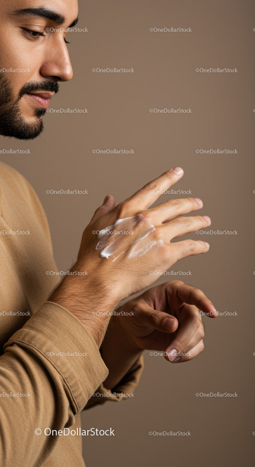 Mężczyzna nakładający krem z filtrem przeciwsłonecznym w celu ochrony skóry. Zbliżenie.
