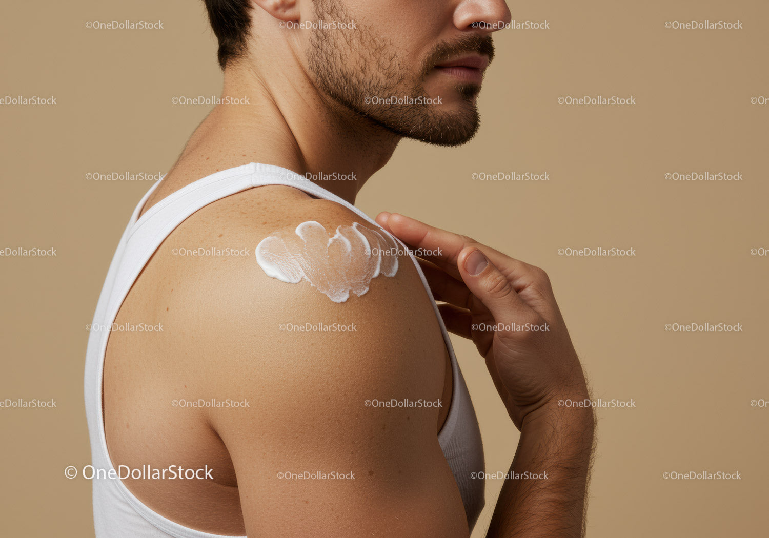Nie możesz dodać więcej Mężczyzna nakładający krem z filtrem przeciwsłonecznym na ramię w celu ochrony skóry w Użytek osobisty do koszyka