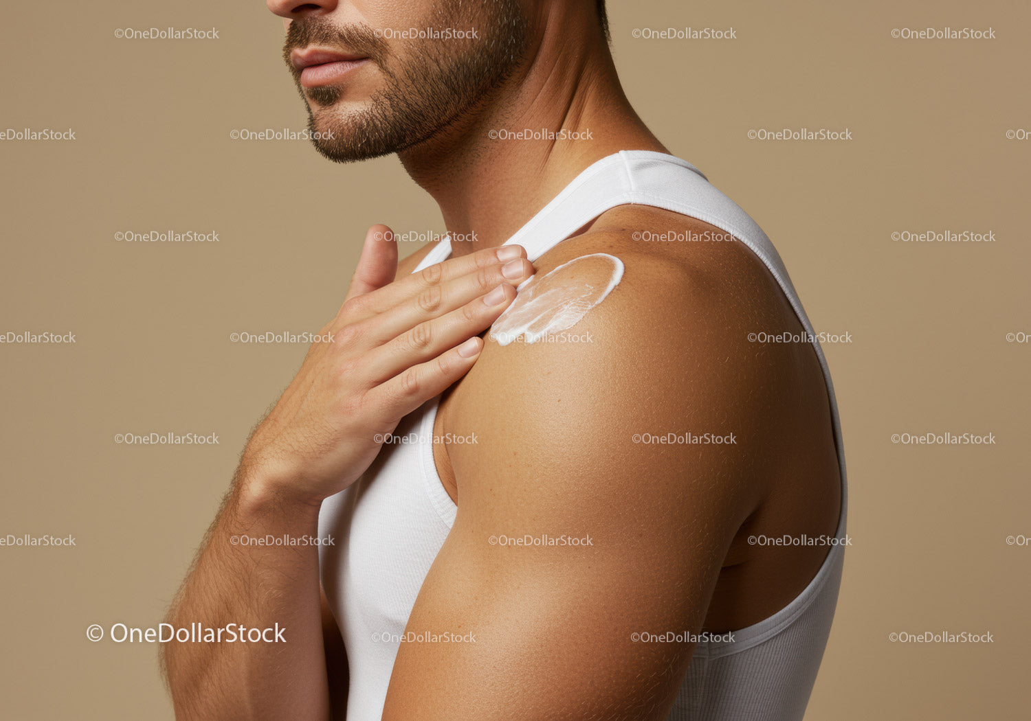 Zbliżenie na mężczyznę z zadbanym zarostem w białym podkoszulku, nakładającego krem z filtrem lub balsam na ramię. Ciepłe, beżowe tło tworzy delikatną i przyjazną atmosferę, podkreślając zdrowie skóry i jej pielęgnację. Zdjęcie przedstawia ochronę przeciwsłoneczną, pielęgnację osobistą, niezbędne produkty do pielęgnacji skóry oraz przekazy dotyczące zdrowego stylu życia, idealne do kampanii promujących urodę, zdrowie i dobre samopoczucie.