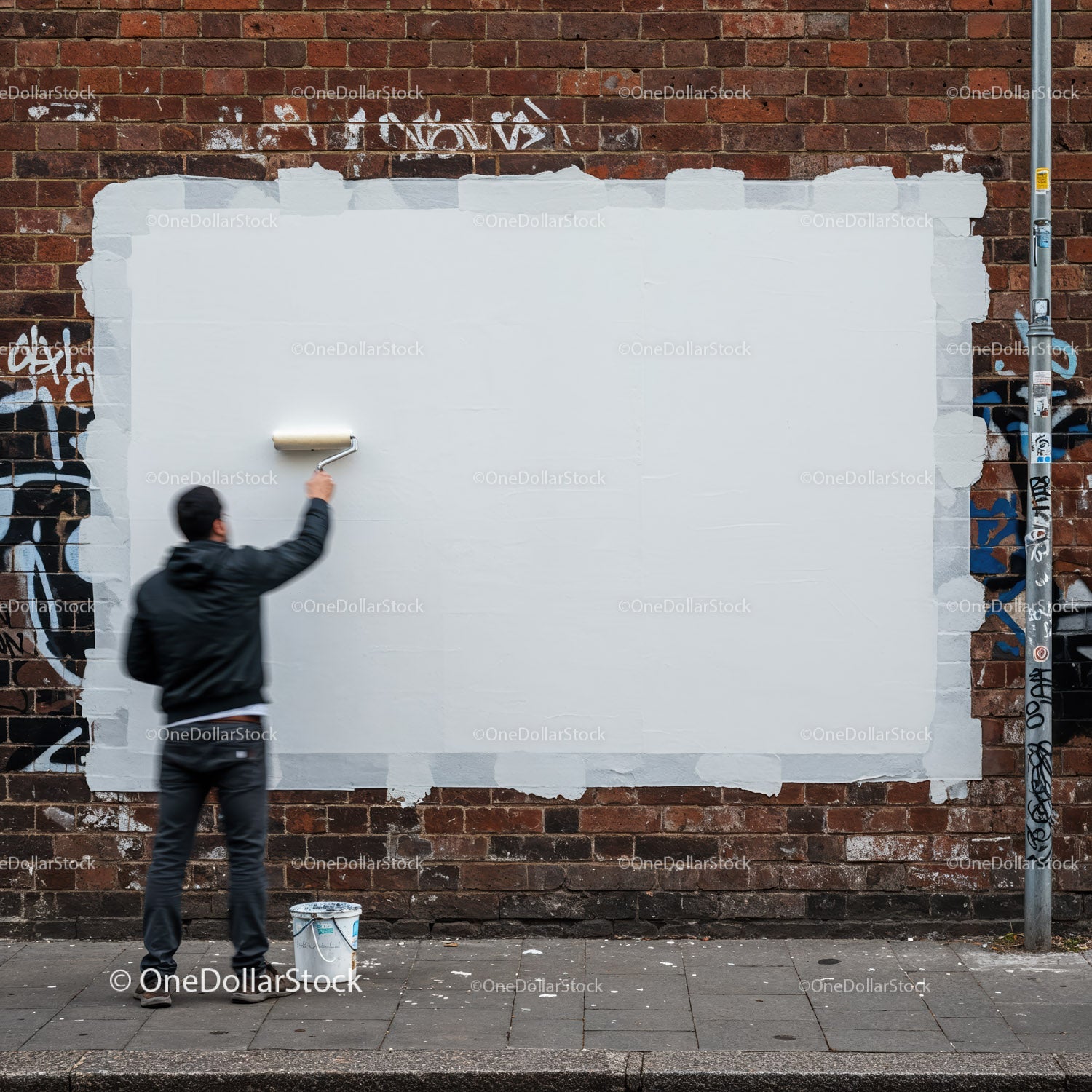Mężczyzna malujący pusty biały prostokąt na ceglanej ścianie