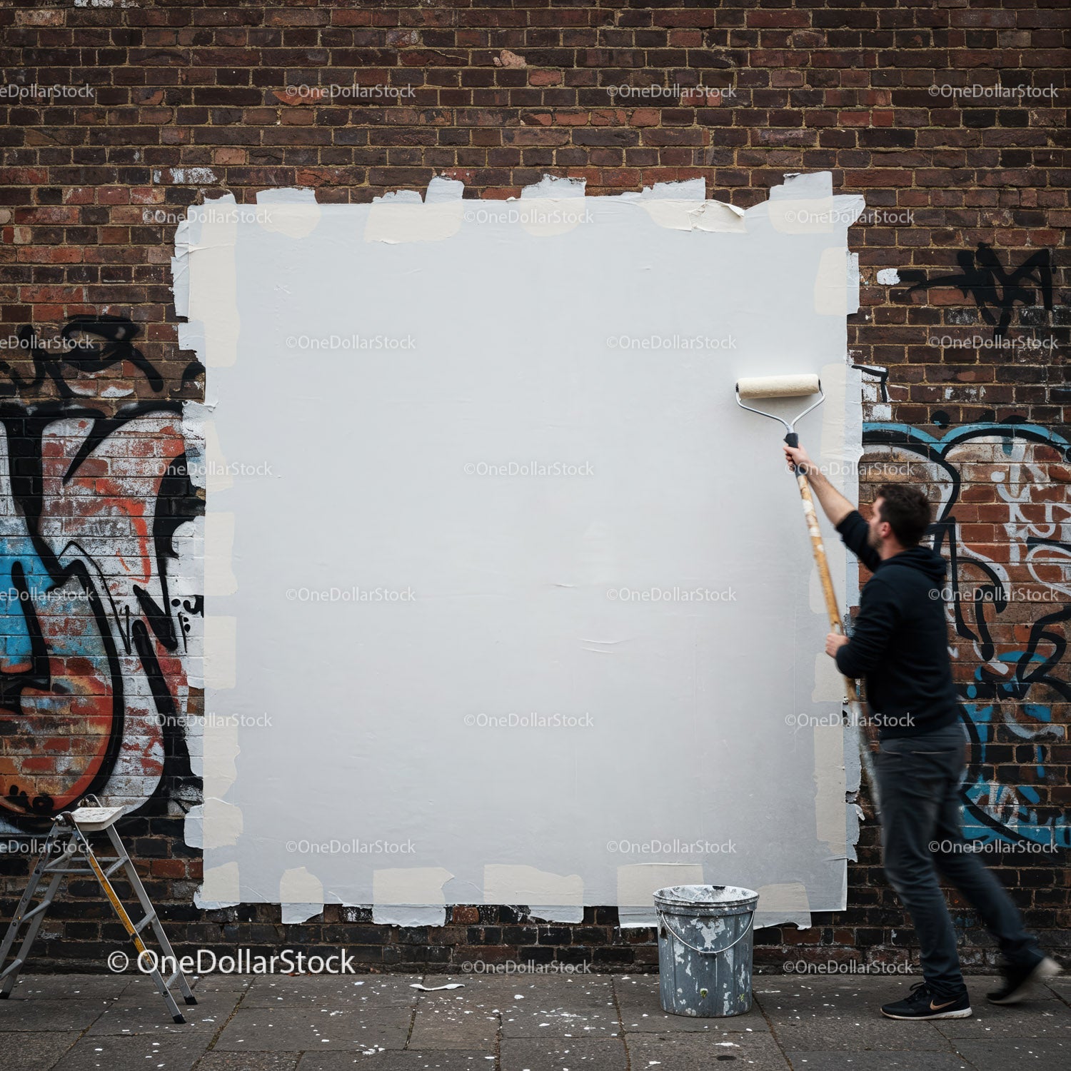 Mężczyzna malujący graffiti na miejskiej ścianie z cegieł