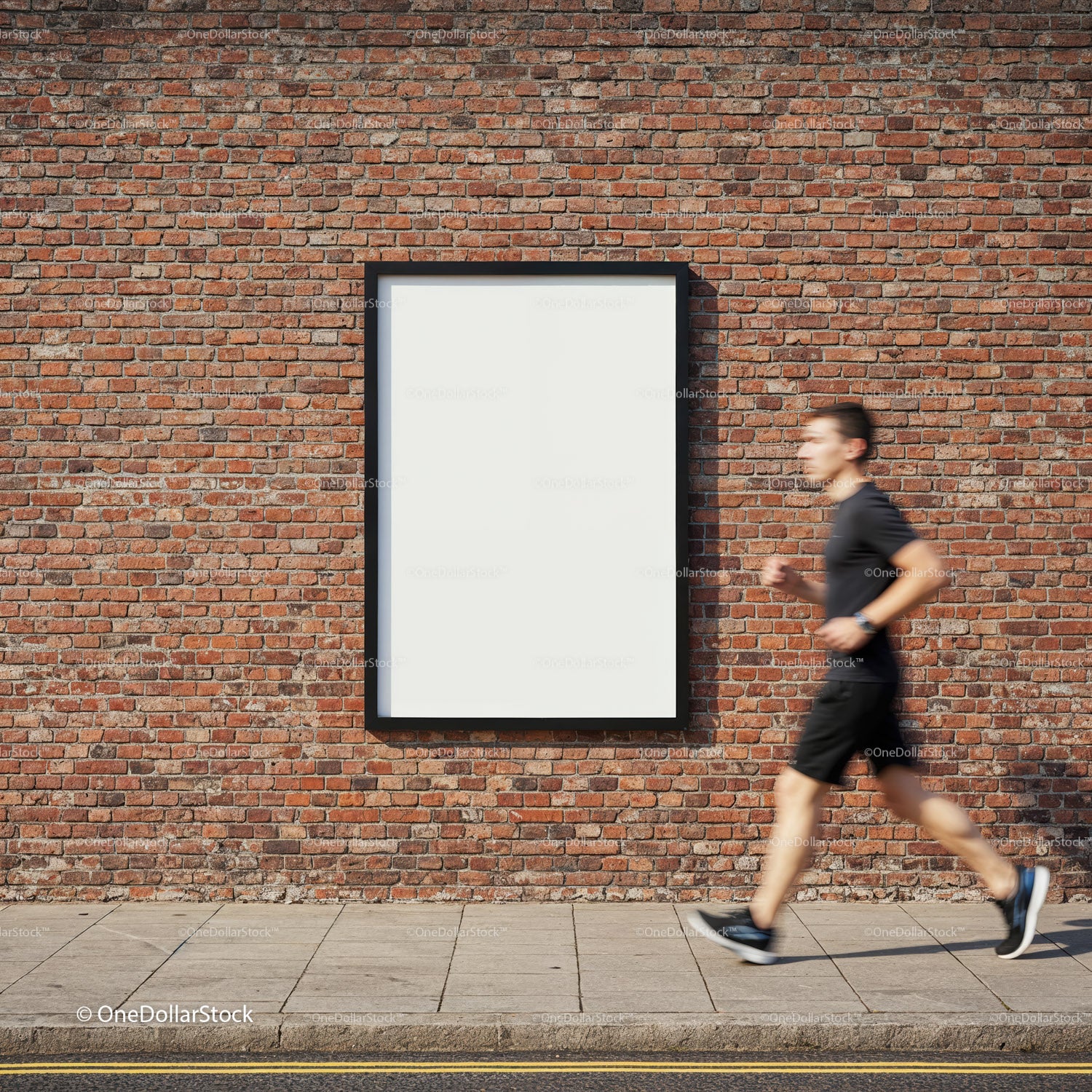 Mężczyzna biegnący obok pustego plakatu na ceglanej ścianie