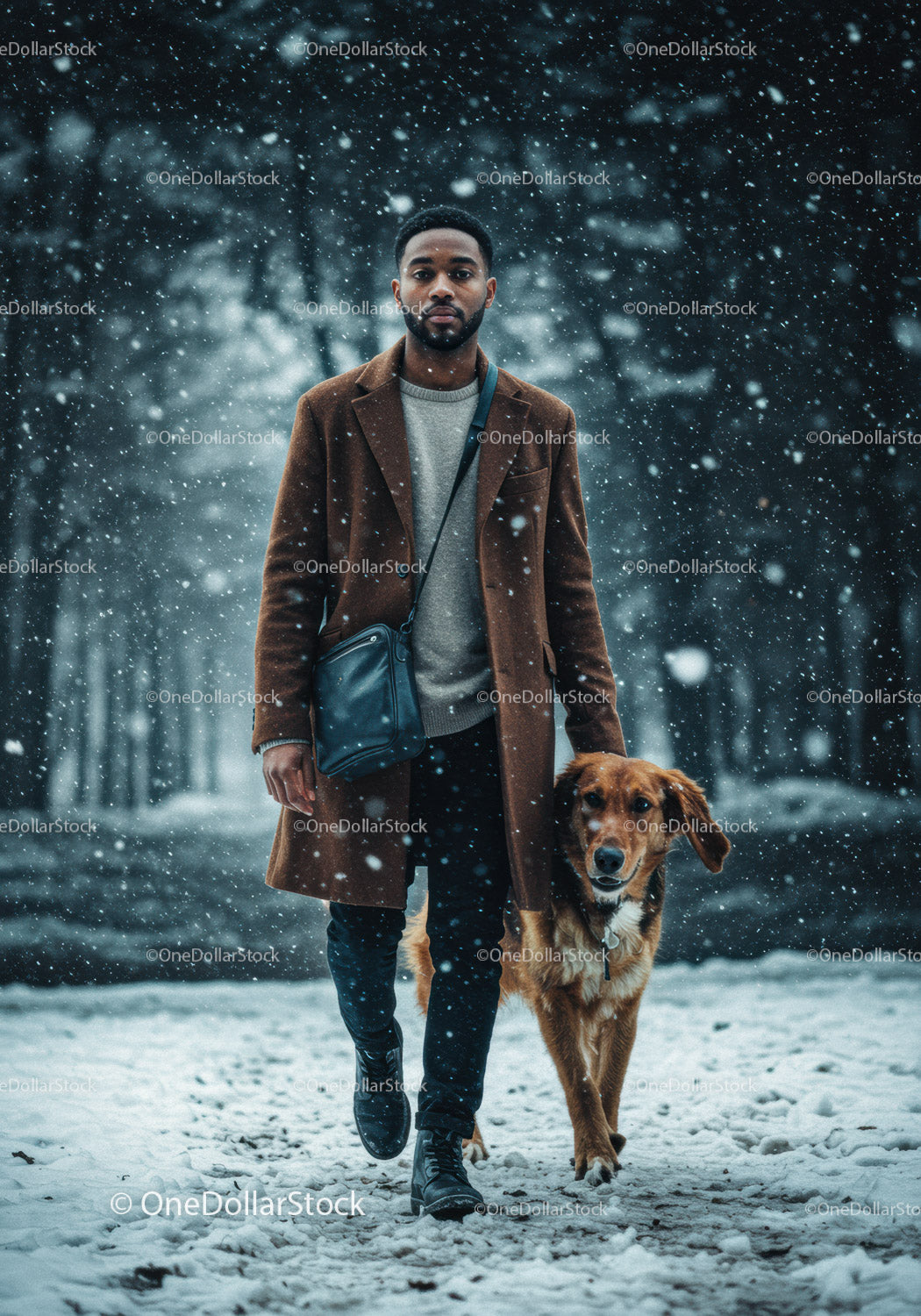 Mężczyzna wyprowadzający psa na zaśnieżoną leśną ścieżkę