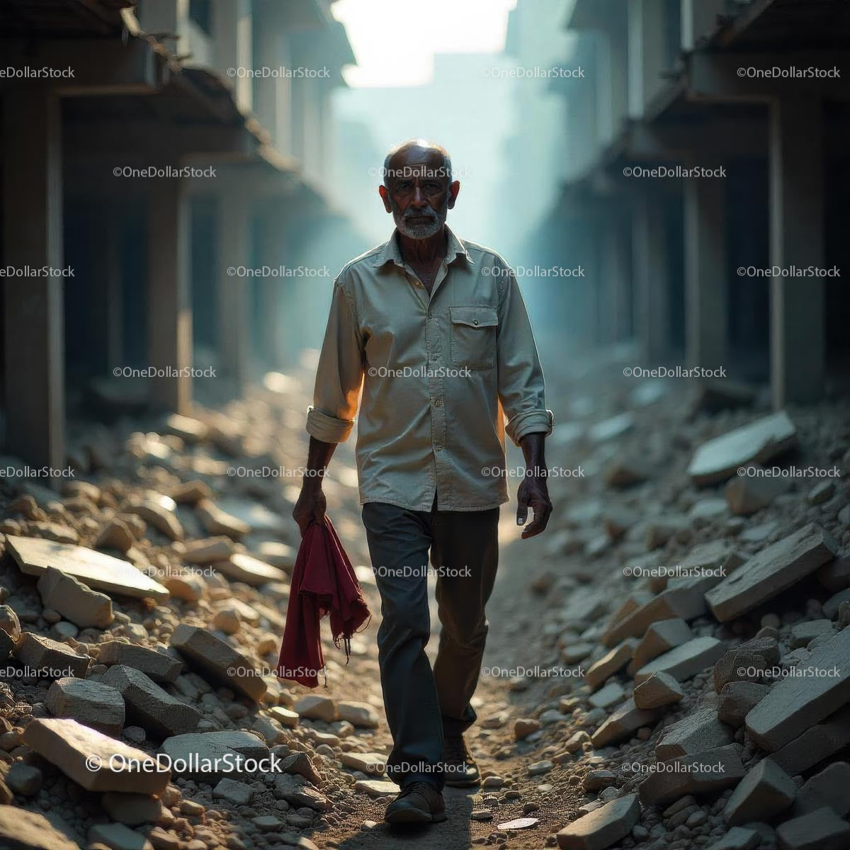 Mężczyzna spacerujący po opuszczonych ruinach miejskich