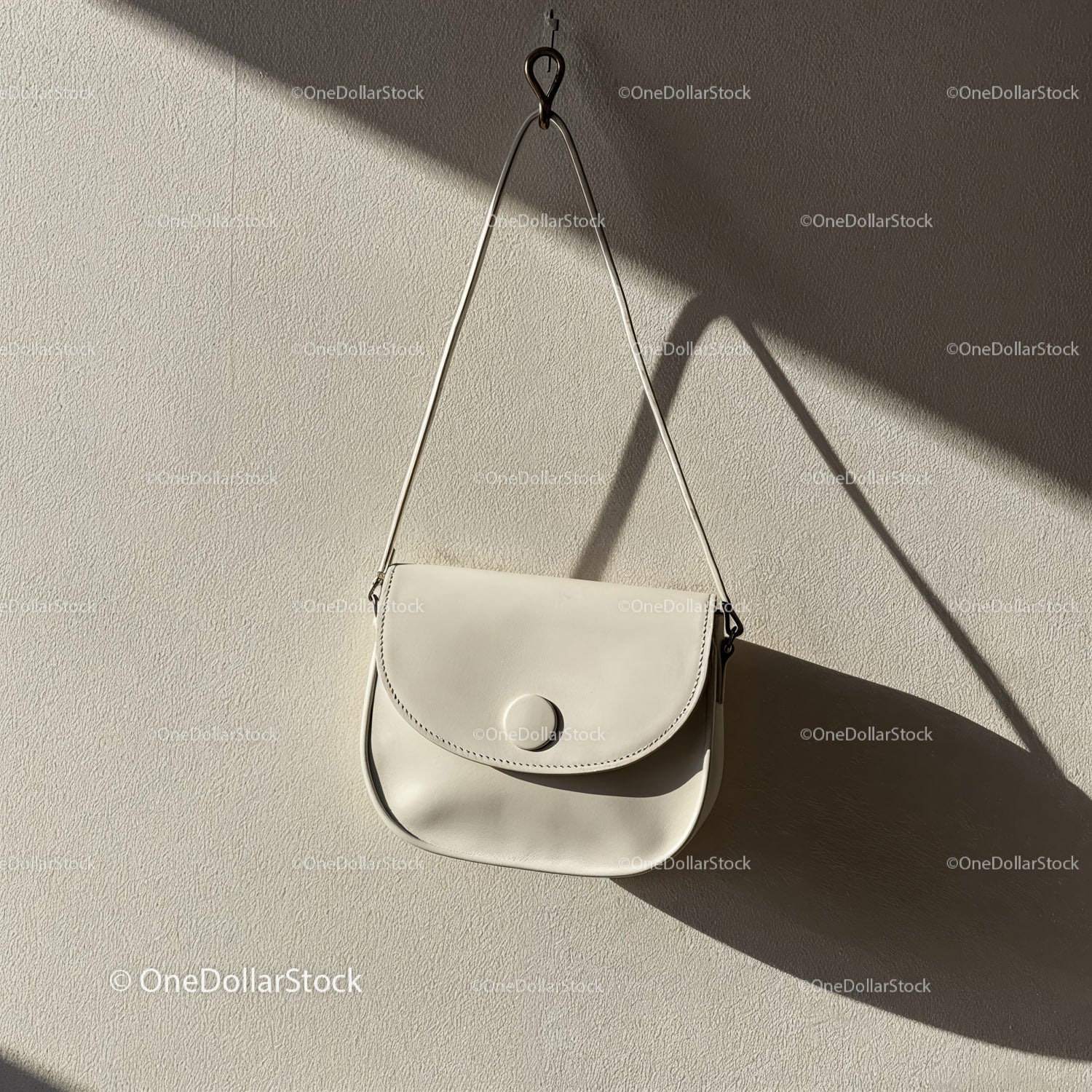 Minimalistyczna biała skórzana torebka wisząca na ścianie