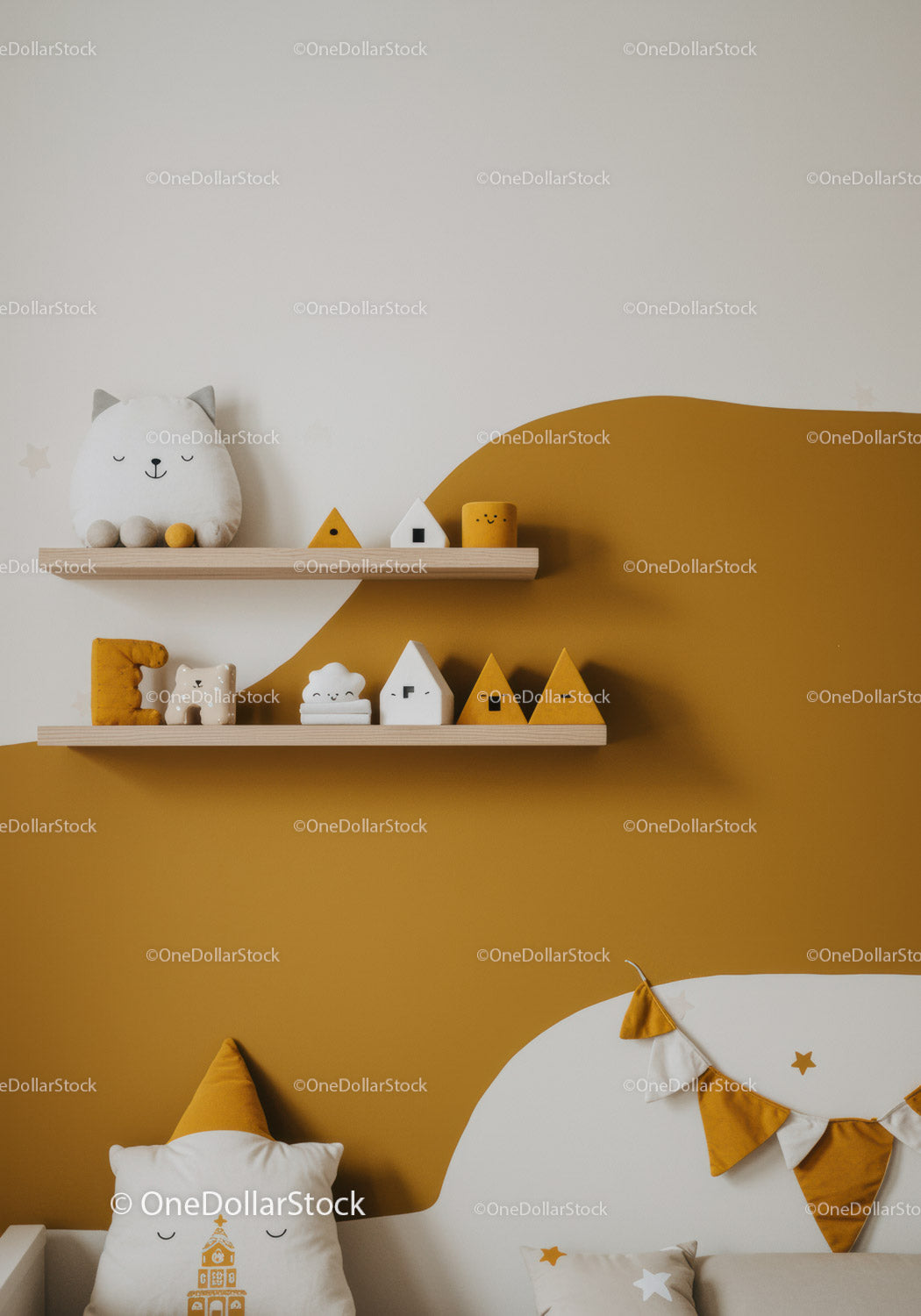 Nowoczesny wystrój pokoju dziecięcego z pluszowymi zabawkami i geometrycznymi akcentami