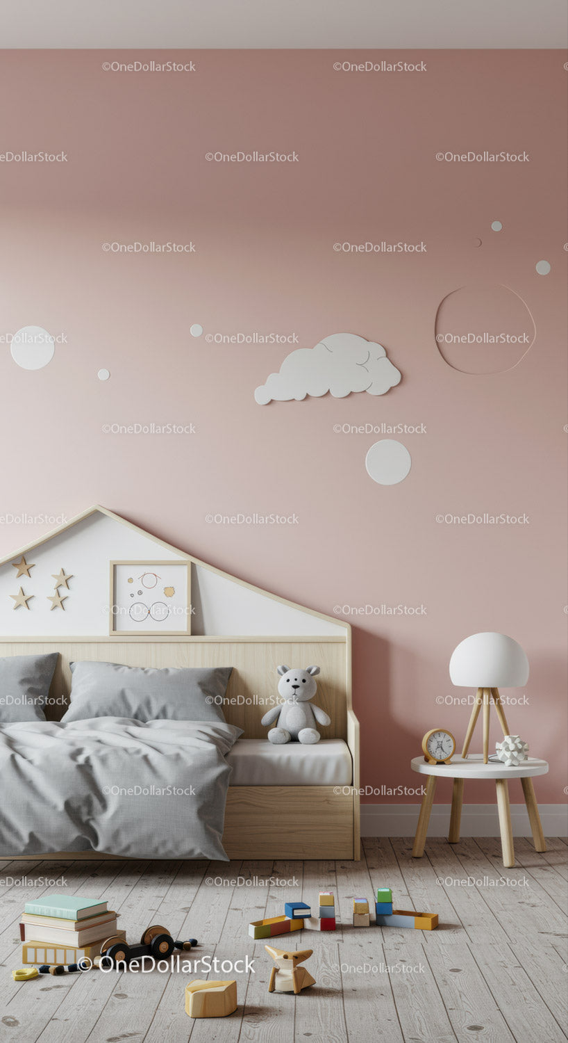 Nowoczesny pokój dziecięcy ze ścianą z motywem chmur i wesołymi dekoracjami