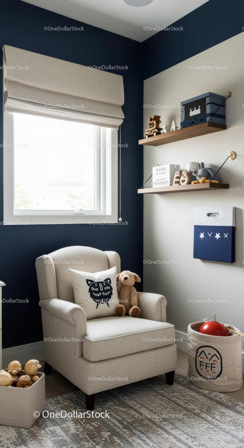 Nowoczesny pokój dziecięcy z wygodnym fotelem i półkami ściennymi