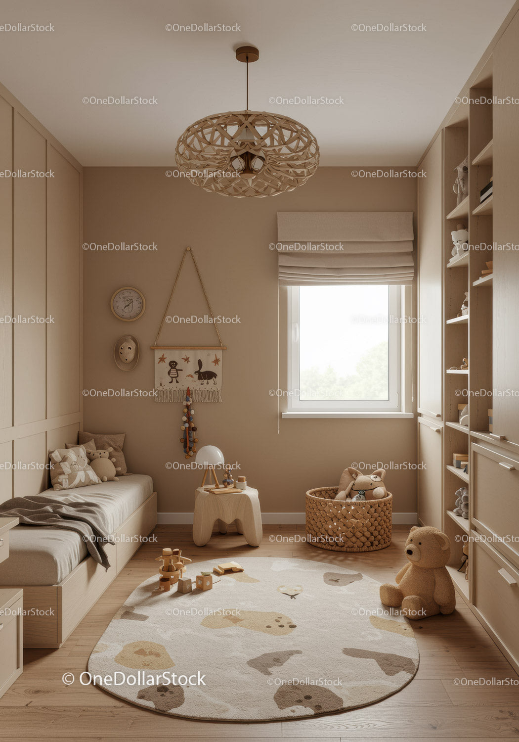 Nowoczesny, neutralny pokój dziecięcy z drewnianymi dekoracjami i pluszowymi zabawkami